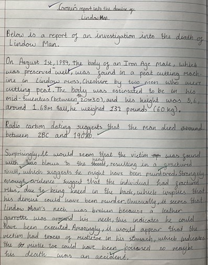 In Year 5, the children recreated the famous Lindow Man by drawing around a member of their group and using historical evidence to add accurate details. This hands-on activity helped them think like writers and formed the basis of their coroner’s reports, one of which we have attached for you to read.
