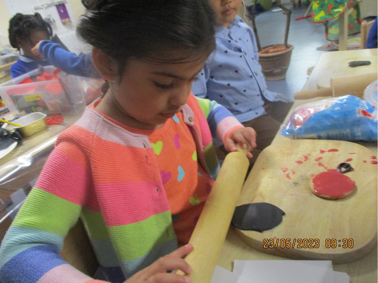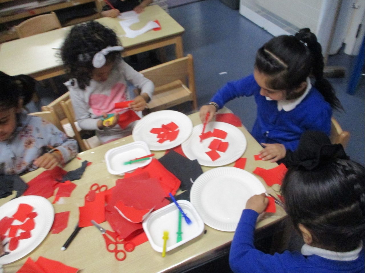 The children used lots of creative skills to create ladybirds. They independently painted ladybirds, using red and black paint. They used scissors skills to cut out ladybirds. They used different black and red materials to collage paper plates and they also used red play dough to make ladybirds.