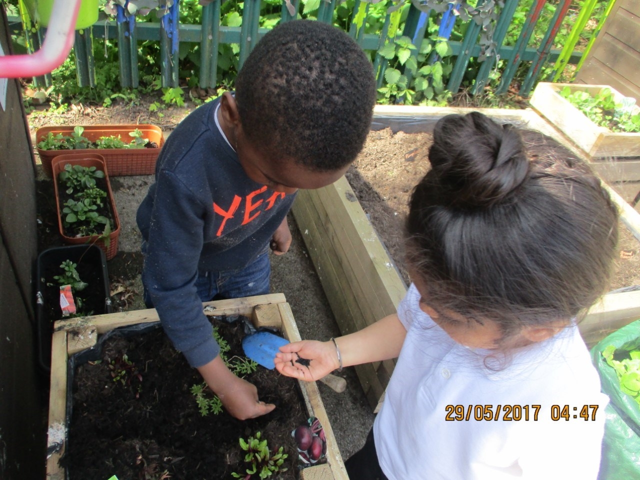 The children talked about the size of the seeds before they planted them. They pushed the seeds down in the soil with their fingers, then covered the seed with the soil.