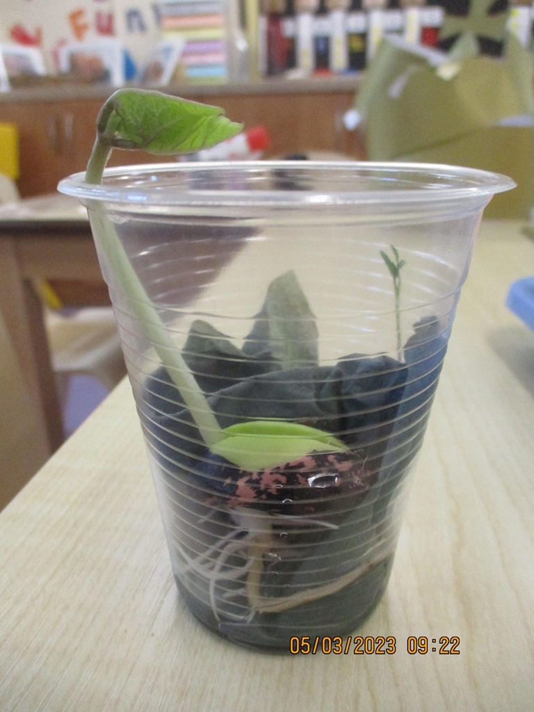 During the two weeks we have also been keeping a very close eye on our cress seeds and our bean. We were thrilled to see that the cress has grown tall and that the shoot has appeared out of the bean. The bean then grew taller and taller.