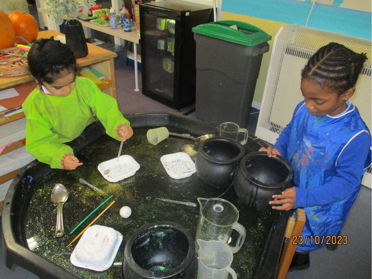 They made potions using glitter, pipettes and wobbly eyes! Decorated and painted pumpkins, used spoons to get the seeds out, threaded sticks through holes in the pumpkins and had lots of fun dressing up!