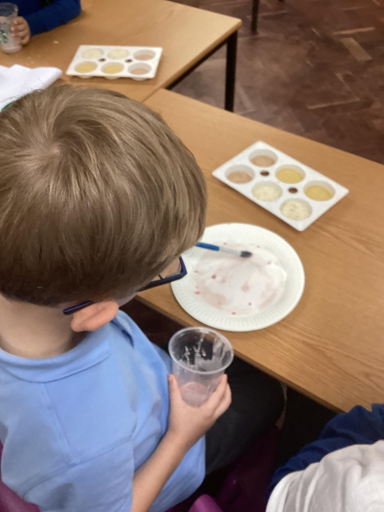 This afternoon Year 3 have been creating their own prehistoric paint palette using natural resources. We mixed flour with water and berries to make pink paint and used charcoal to make black paint. Then the children created their own textured background to create their cave wall using rice, couscous and sand. They had so much fun!