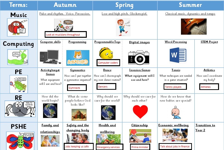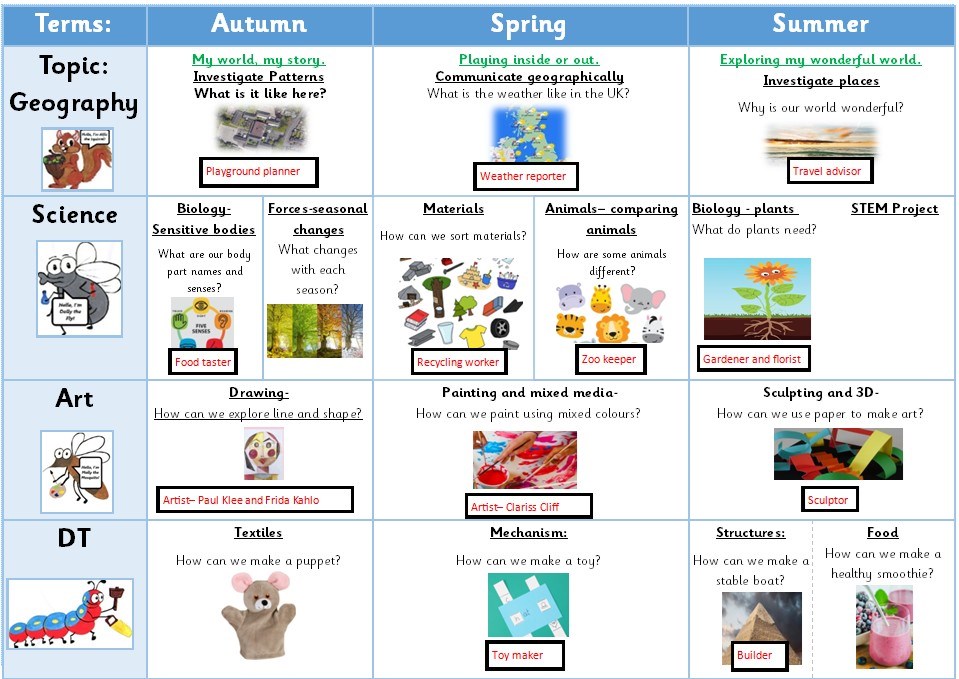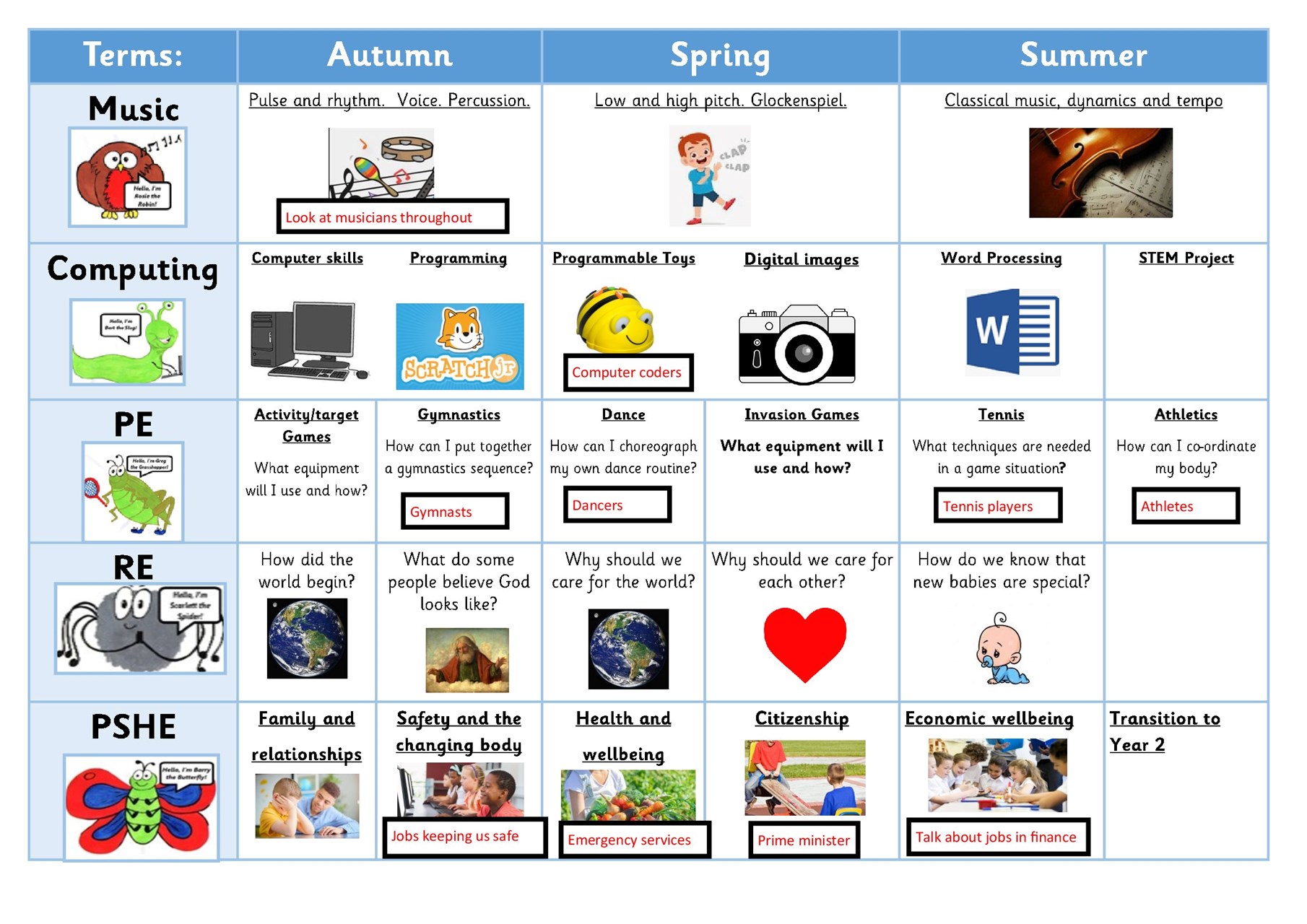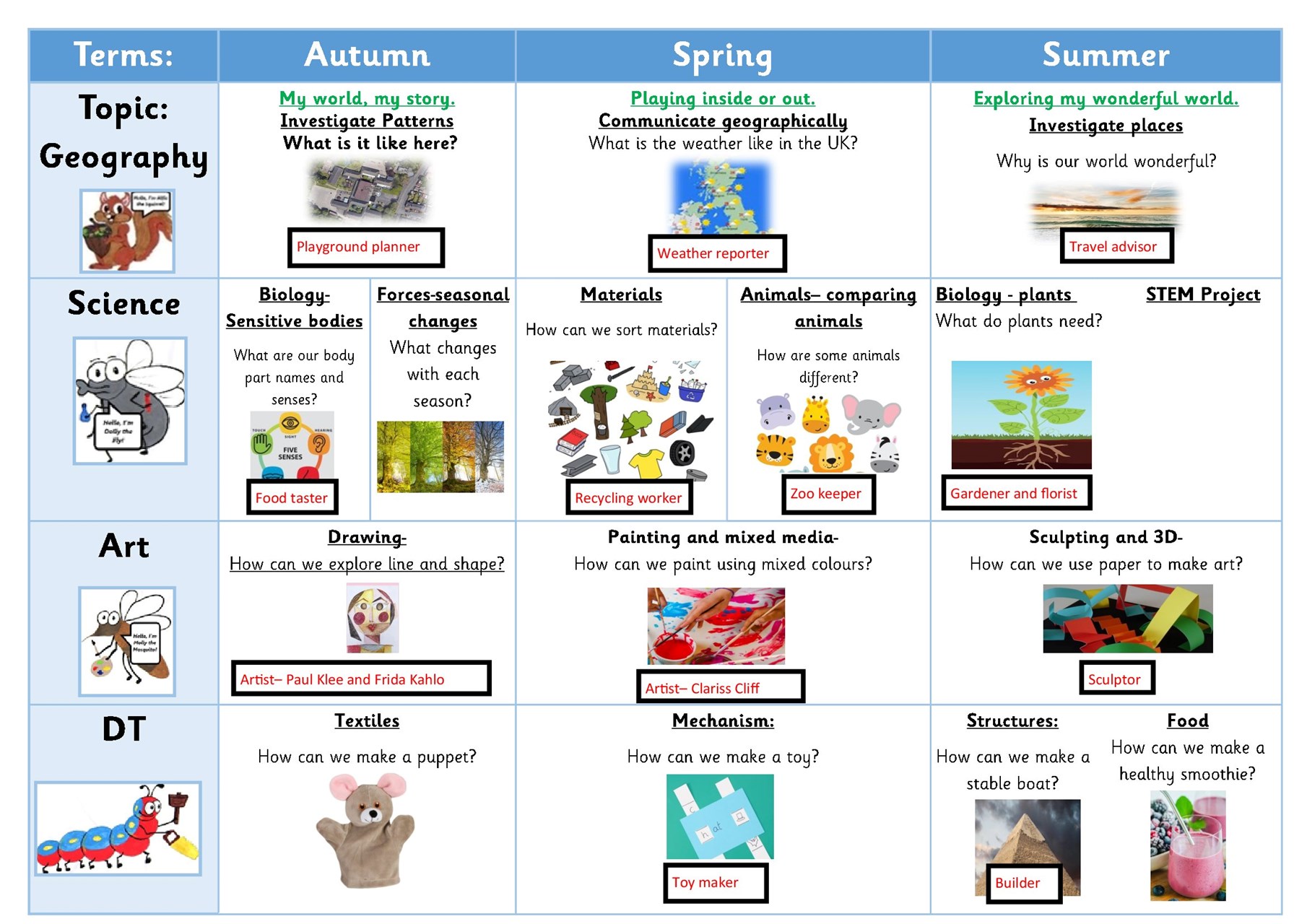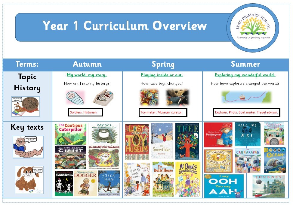 A curriculum overview shows the intended learning for Year 1 throughout the academic year. It showcases the enquiry question learning focuses on for each subject, as well as core texts used and experiences children will take part in.