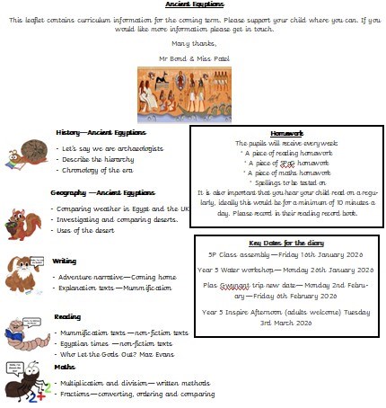 Parents are invited to explore our Egyptian curriculum flyer, which outlines the learning taking place across this exciting topic. As pupils study Ancient Egypt, they develop an understanding of communication through the discovery of the Rosetta Stone, explore the hierarchy of civilisation and consider ideas of creation, belief, and legacy. Learning is carefully linked across subjects to deepen knowledge, encourage curiosity, and help children understand how this ancient civilisation continues to influence the modern world.
